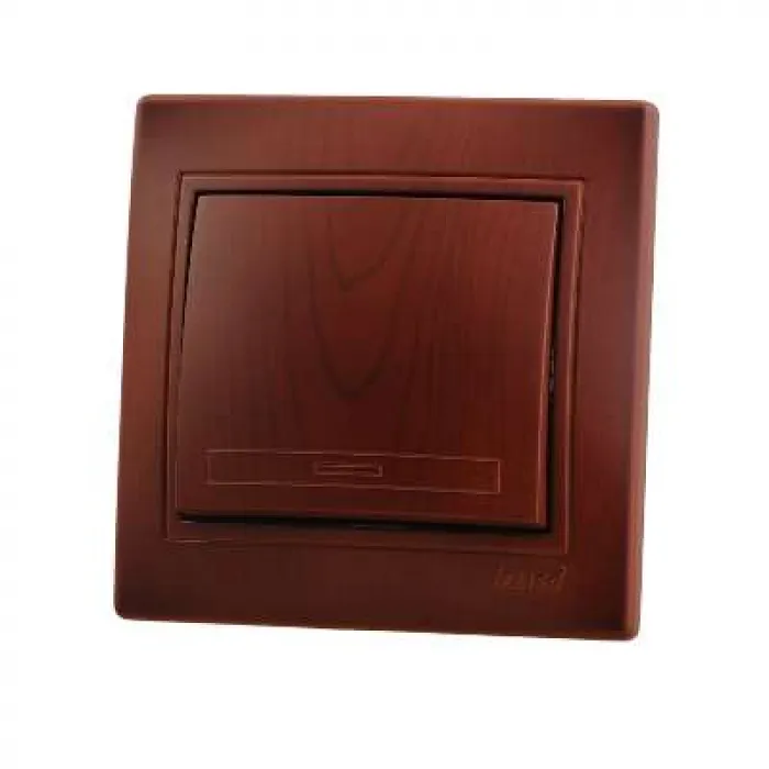 Выключатель одинарный. Изделия с расцветкой «под дерево» изготовлены из покрашенного «под фактуру» пластика, а не оклеены цветной пленкой. Безопасные для рук крепежные выступы с пружиной и возвратом в исходное положение. Серебряные контакты, выполнены по стандарту из сплава.Опорна плата с маркировкой, на все изделия нанесены схемы электрического соединения. Надежные соединения с помощью шайб с насечкой. Простой монтаж и демонтаж. Нержавеющий металлический каркас. Защита пальцев. Напряжение 250