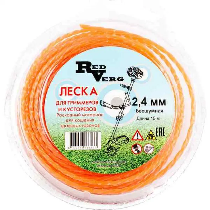 Леска для триммера RedVerg диаметром 2,4 мм и длиной 15 метров - надежный инструмент для обработки газонов и участков. Витая конструкция обеспечивает бесшумную работу триммера, минимизируя шум и вибрации. Прочный материал лески обеспечивает долговечность и эффективную обрезку травы, сорняков и кустов. Этот продукт идеально подходит для профессионального использования и для ухода за садом и приусадебным участком.