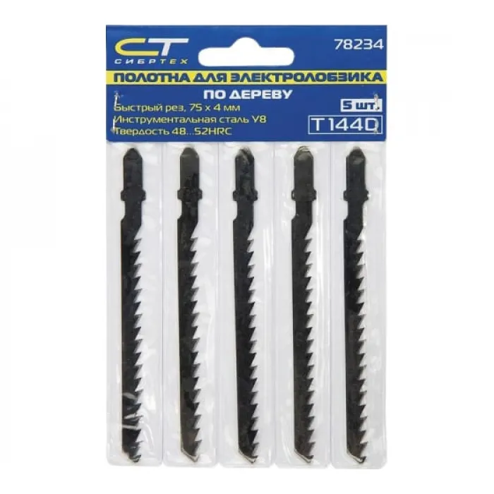 Полотна для электролобзика по дереву, 5 штук в упаковке. Модель T101BR, размер 75 х 2,5 мм, зубья обратного типа. Идеально подходят для точной и чистой обрезки и распиловки древесины. Производитель - компания СИБРТЕХ. Качественный инструмент для профессионального и домашнего использования.
