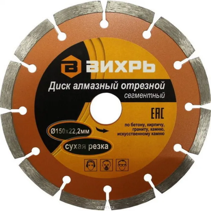 Диск алмазный 150 х 22,2 мм, отрезной, сегментный, сухая резка 73/10/3/3 предназначен для сухой резки материалов. Это означает, что его можно использовать без применения воды или других охлаждающих средств. Такой тип диска обычно используется для резки керамической плитки, камня, бетона и других твердых материалов.