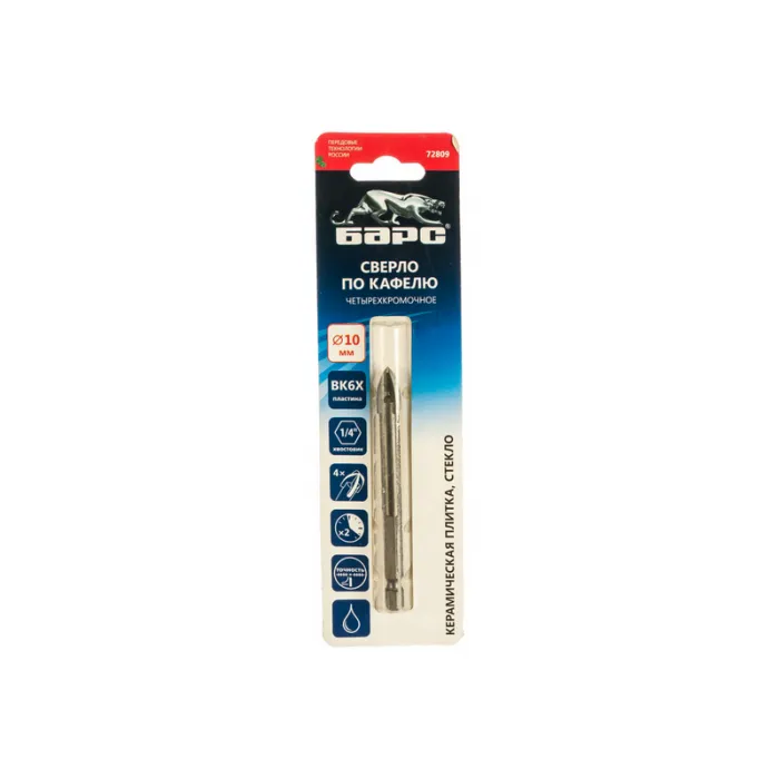Сверло по керамической плитке 10 мм, крестовая пластинка, шестигр. хвостовик // БАРС, Нижний Новгород