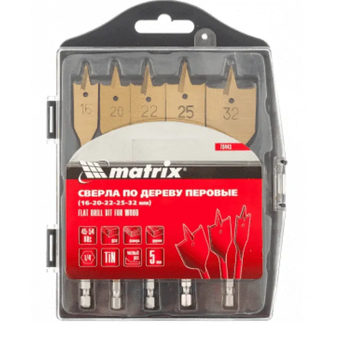 Набор сверл перовых по дереву 16-20-22-25-32 мм, 5 шт., пластиковый кейс//MATRIX, Нижний Новгород