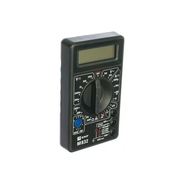 Мультиметр цифровой M832 EKF Master - это универсальный прибор для измерения различных параметров электрических цепей. Он обладает высокой точностью измерений и широким диапазоном функций, что делает его незаменимым инструментом для профессионалов в области электротехники, автомобильного ремонта, электроники и других смежных отраслей.Мультиметр M832 EKF Master позволяет измерять переменное и постоянное напряжение, силу тока, сопротивление, ёмкость, частоту, температуру и другие параметры. Он оснащен большим жидкокристаллическим дисплеем с подсветкой, что обеспечивает удобство использования в условиях недостаточного освещения.