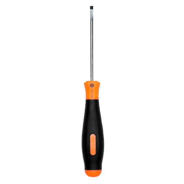 Отвертка изготовлена из прочного материала, что гарантирует её долгий срок службы. Оранжевый цвет обеспечивает хорошую видимость инструмента на рабочей поверхности, что позволяет избежать его случайной потери или повреждения.