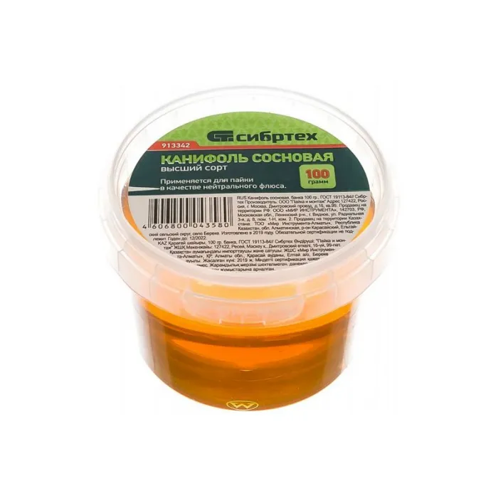 Канифоль сосновая 100 гр. банка ГОСТ 19113-84// Сибртех 913342 - это натуральный продукт растительного происхождения, получаемый из сосновой смолы. Канифоль широко используется в различных отраслях промышленности, таких как медицина, строительство, химическая промышленность и другие. Она обладает антисептическими свойствами и может использоваться для обработки ран, ожогов, а также как противовоспалительное средство. Благодаря удобной упаковке в банке весом 100 гр., канифоль легко хранится и транспортируется. Продукт соответствует ГОСТ 19113-84 и произведен компанией Сибртех, что гарантирует его высокое качество и надежность.