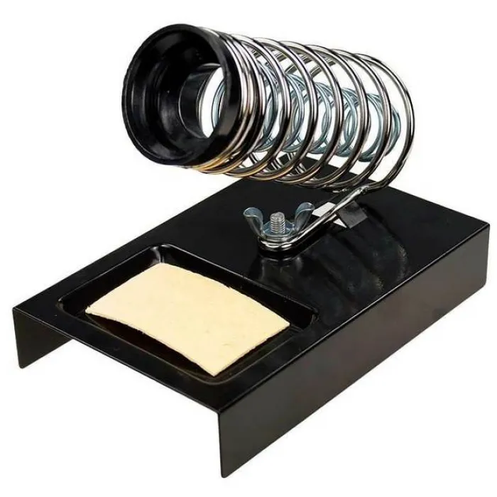 Подставка FD 7049 (ZD-10A) под паяльник предназначена для безопасного хранения паяльника при нагревании, в промежутках между использованием и охлаждении. Выполнена из витой хромированной конусообразной пружины и металлической платформы с ложементом под губку для очистки жала паяльника от остатков припоя. Губка для очистки жала паяльника в комплекте. Паяльник легко и удобно помещается в направляющую. Для безопасного хранения и бережной транспортировки предусмотрена картонная коробка.