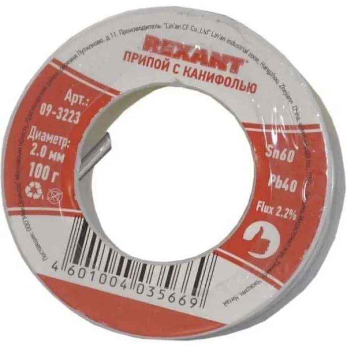 Припой с канифолью 100 гр. d=2.0 мм (Sn60 Pb40 Flux 2.2%) REXANT арт.09-3223, Нижний Новгород