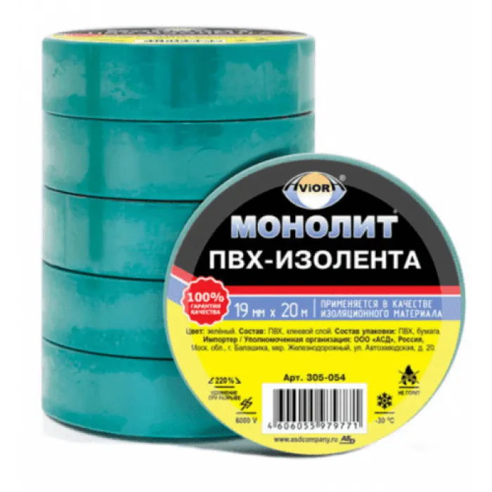 Изолента ПВХ зеленая 19мм 20м AVIORA-МОНОЛИТ - это высококачественная изолента, предназначенная для электрических работ и изоляции проводов. Ширина ленты составляет 19 мм, а длина - 20 метров, что обеспечивает достаточное количество материала для проведения различных работ. Зеленый цвет ленты помогает легко отличать изолированные участки от других проводов. Прочный клейкой слой обеспечивает надежное крепление и защиту от влаги и воздействия окружающей среды. AVIORA-МОНОЛИТ - это надежный выбор для профессиональных электриков и любителей, занимающихся ремонтными работами.