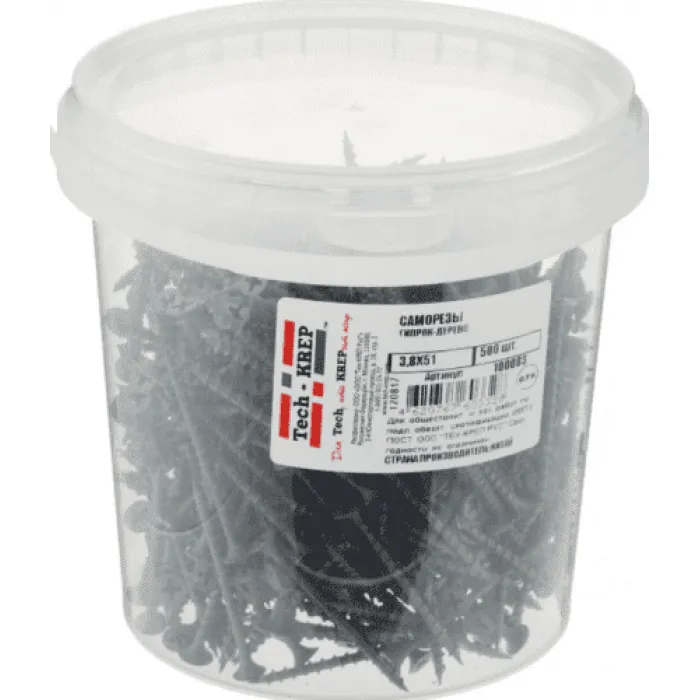 Эти саморезы идеально подходят для использования в строительстве, ремонте и других работах по дереву. Упаковка в виде ведра содержит 500 штук, что обеспечивает достаточное количество для выполнения большого объема работ. Надежные и удобные в использовании, саморезы Tech-Krep станут надежным помощником в ваших строительных проектах.