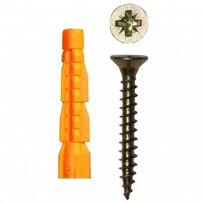 Саморез универсальный оцинкованный в комплекте с полипропиленовым дюбелем применяется для монтажа различных деталей (пластины, рейки, электрические ящики, розетки, коробки и т.д.) к прочным материалам (бетон, кирпич, камень) и пустотелым материалам (пустотелый кирпич, поризованый блок и пр.).