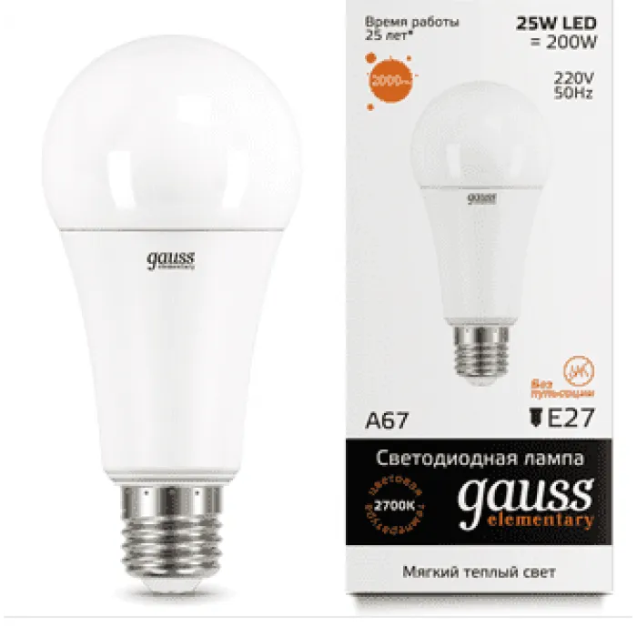 Лампа Gauss LED Elementary A67 25W E27 2700K 1/10/50 Аналог лампы накаливания, Вт: 200Время работы, ч: 25000