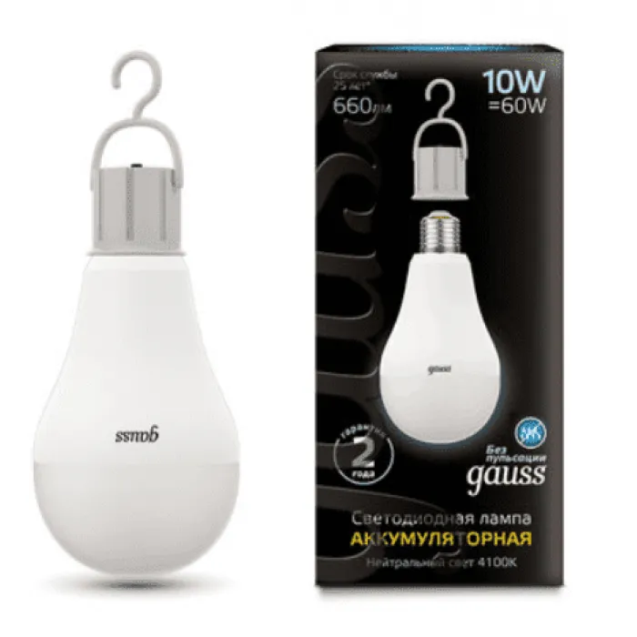 Лампа Gauss LED A60 10W E27 660lm 4100K с Li-Ion аккумулятором 102402200 Световой поток: 660Цветовая температура: 4100К