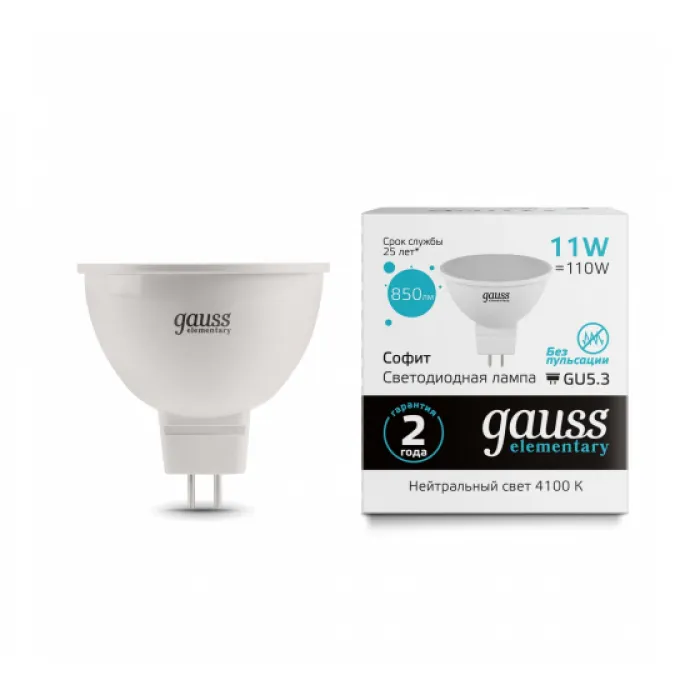 Лампа диммируемая светодиодная Gauss MR16 Elementary 11W 850lm 4100K GU5.3 MR16, 13521, Нижний Новгород