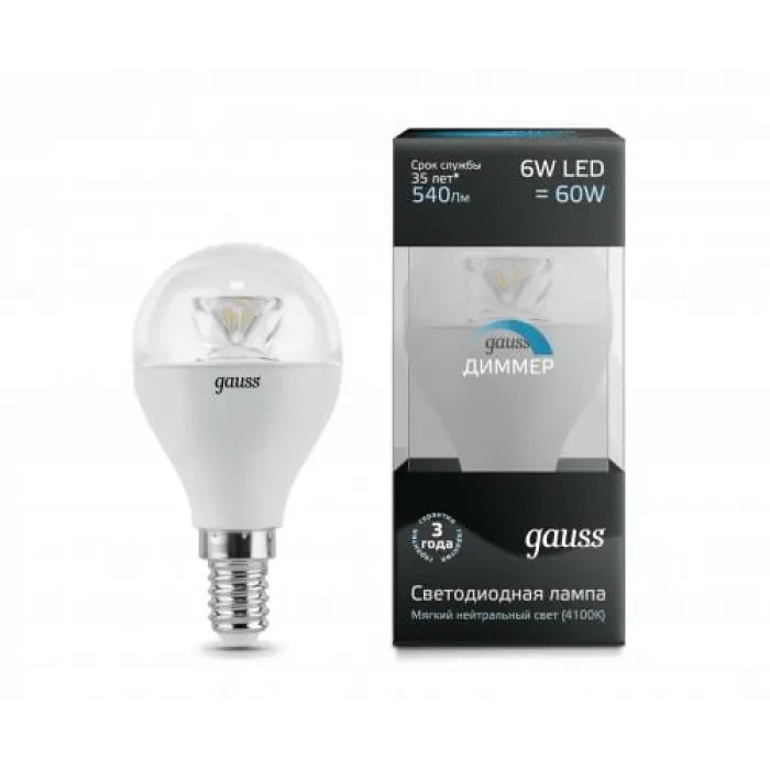 Лампа диммируемая светодиодная Gauss G45 (Шар) 6W E14 4100K, 105201206-D, Нижний Новгород