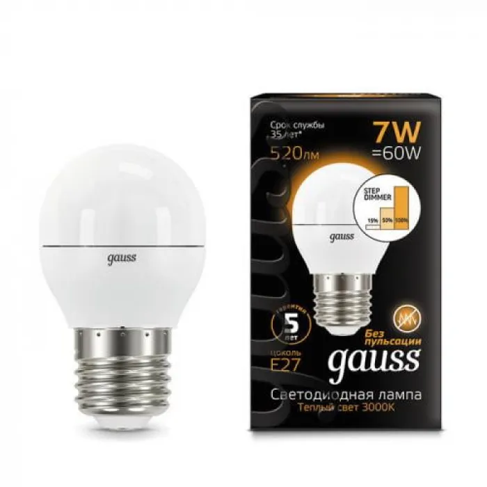 Лампа диммируемая светодиодная Gauss G45 (Шар) 7W E27 2700K/3000К, 105102107-S, Нижний Новгород