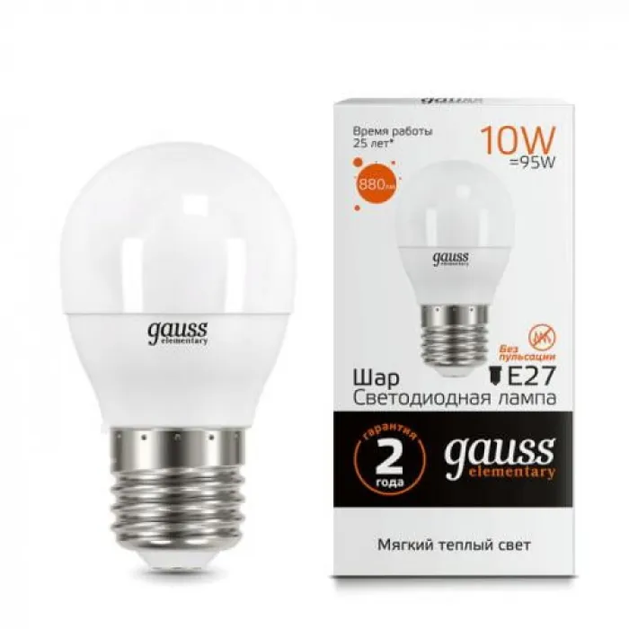 В нашем магазине Главэлектрика в Нижнем Новгороде, вы можете приобрести с доставкой по Нижнему Новгороду товар Лампа светодиодная Gauss G45 (Шар) Elementary Globe 10W E27 3000K, 53210.