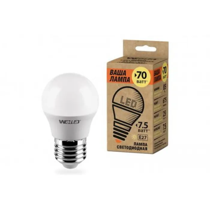 Лампа светодиодная Wolta G45 (Шар) 7,5Вт 25Y45GL7,5 Е27 3000К, 25Y45GL7.5E27, Нижний Новгород