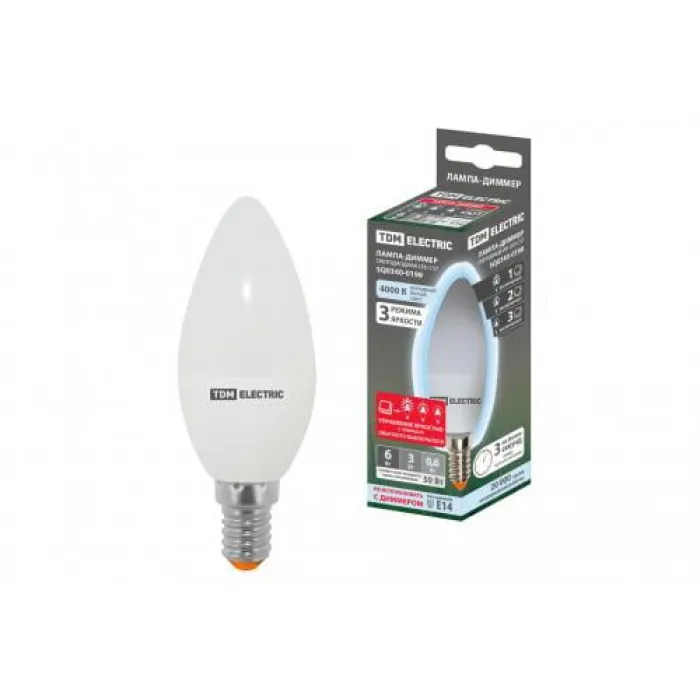 Лампа шагового диммирования светодиодная TDM свеча С37 6Вт-230В 4000К E14 отличается высокой энергоэффективностью и превосходным качеством света. Эта лампа является идеальным выбором для тех, кто ценит комфортную атмосферу и экономию энергии.