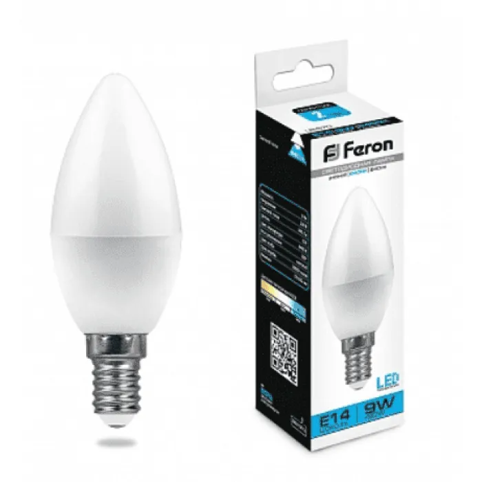 Лампа светодиодная FERON LB-570, C37 (свеча), 9W 230V E14 6400К (белый), рассеиватель матовый белый, 840Lm, угол рассеивания 200°, корпус пластик, 100*37мм