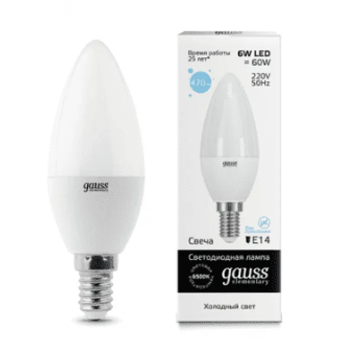 Лампа Gauss LED Elementary, Candle, мощность 6W, цоколь E14, цветовая температура 6500K Категория цветности светаХолодная дневного света (>5300 К)