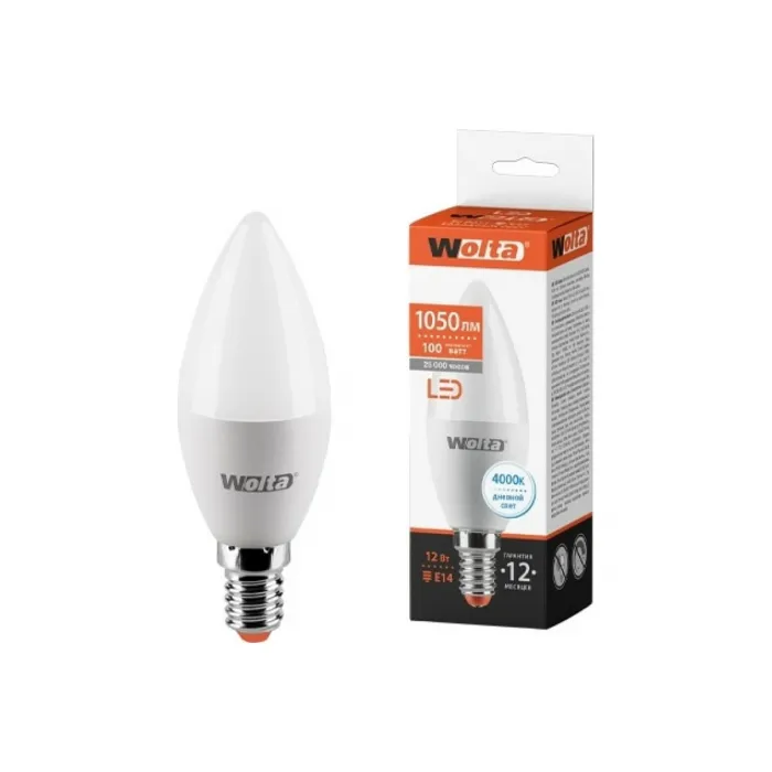 Светодиодная лампа Wolta C37 12Вт 1050лм 4000К Е14 1/50 25SC12E14 - это энергоэффективная лампа с цоколем Е14, которая обеспечивает яркое освещение до 1050 люмен при потреблении всего 12 ватт электроэнергии. Свет лампы имеет нейтрально-белый оттенок (4000K), что создает комфортную атмосферу в помещении. Продукт имеет длительный срок службы до 25000 часов и отличается надежностью и долговечностью. Лампа подходит для использования в различных интерьерах, а также может быть установлена в люстры, бра и другие светильники с соответствующим цоколем.