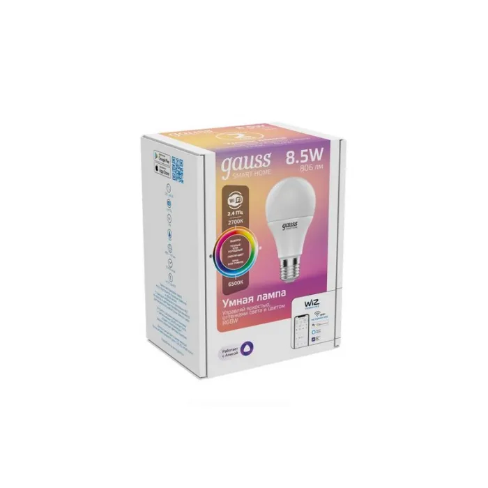 Светодиодная умная лампа Gauss A60 Smart Light RGBW E27 A60 8,5 Вт 2700-6500K, 1170112 - это инновационный и умный источник освещения для вашего дома. Лампа оснащена технологией RGBW, позволяющей создавать разноцветное освещение, а также регулировать цветовую температуру от теплого белого до холодного белого света (2700-6500K). С помощью приложения на смартфоне вы сможете управлять яркостью, цветом и расписанием работы лампы, создавая уютную атмосферу в любом помещении. Лампа имеет цоколь E27, мощность 8,5 Вт и долгий срок службы, что делает ее отличным выбором для вашего дома.