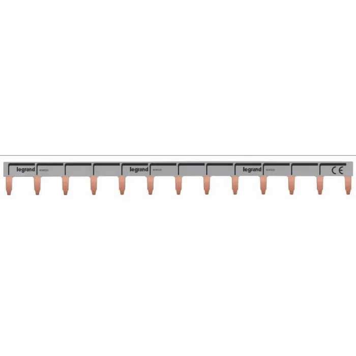 Однополюсная гребенка для соединения автоматических выключателей. Двухсторонняя цветовая маркировка, с одной стороны синяя линия (обозначает - нулевая шина), с другой стороны черная (обозначает - фазная шина).Максимальное количество подключаемых устройств 13. При необходимости шина разрезается на необходимое количество подключаемых автоматических выключателей.