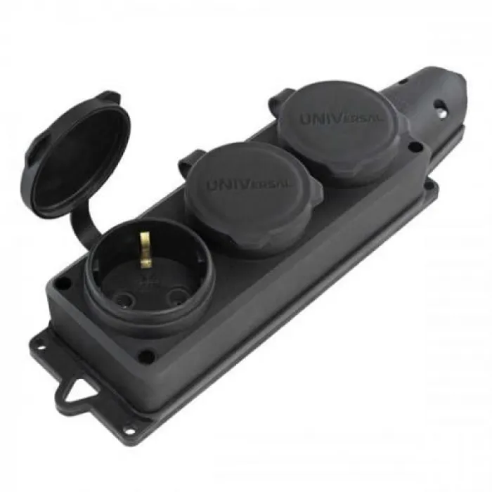 Розетка каучук трехместная с заземлением IP44 компакт UNIVersal Однофазная 3-х местная колодка с заглушками, каучук UNIVersal 1323 применяется для монтажа удлинителя с проводом любой марки, сечения и длины. Для изготовления данной модели используется прочный, надежный и качественный материал. Для защиты от попадания к контактным группам пыли и влаги предусмотрены специальные крышки.