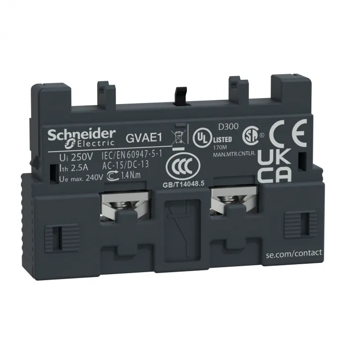 Контакт GVAE1 дополнительный мгновенного действия 1«з» («Schneider Electric»)Предназначен для коммутации электрических цепей сигнализации состояния главных полюсов автомата для защиты двигателя (включено-выключено). Устанавливается на автоматы для защиты двигателя (см. поз. по п/л А8225—А8247) на переднюю крышку.