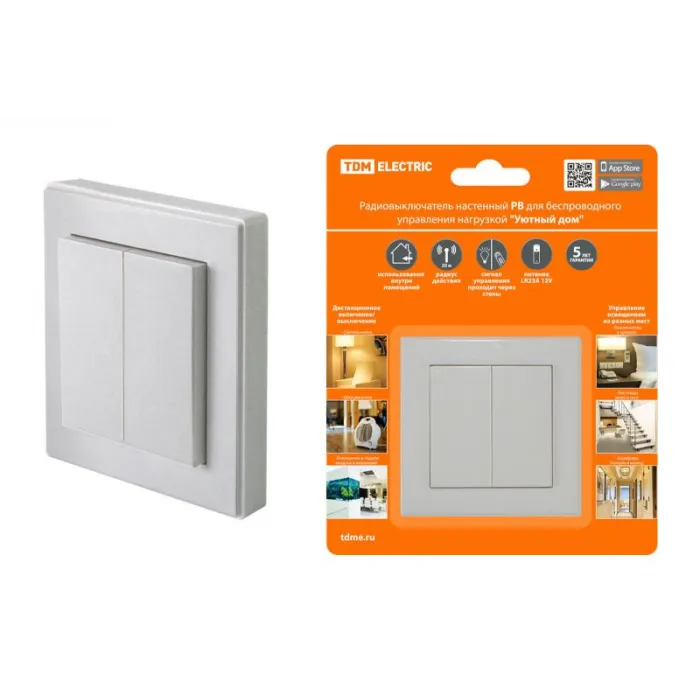 Радиовыключатель настенный РВ2 (2 клав.) для беспроводного управления нагрузкой Уютный дом TDM - это удобное устройство, которое позволяет беспроводно управлять освещением и другими электрическими устройствами в вашем доме. С двумя клавишами для управления, этот радиовыключатель легко устанавливается на стену и интегрируется в интерьер помещения. Благодаря технологии радиосвязи, вы можете управлять нагрузкой с любого места в доме, что делает вашу жизнь более комфортной и уютной.