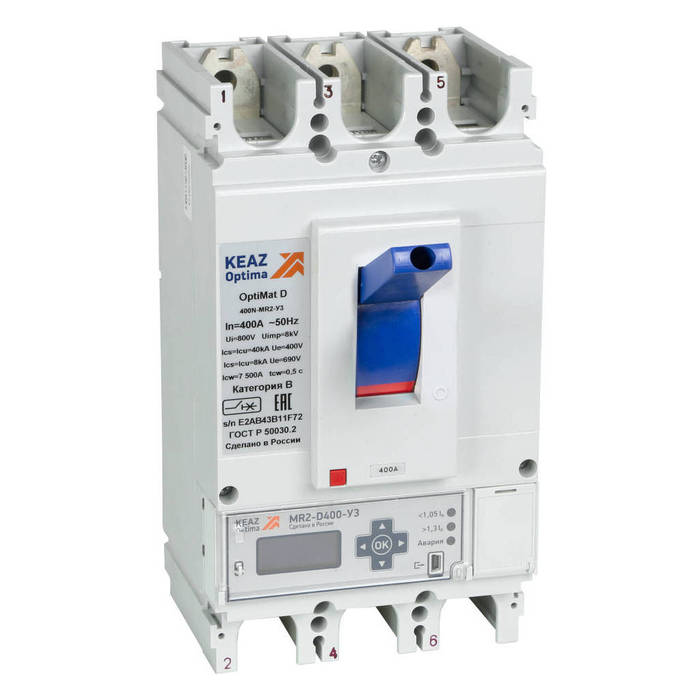 Силовой автомат КЭАЗ OptiMat D имеет максимальную номинальную токовую характеристику в 400А, что позволяет обеспечить стабильную работу системы питания даже при значительных нагрузках. Предусмотрены три полюса для подключения фаз A, B и C, что обеспечивает равномерное распределение энергии по всему электрическому контуру.