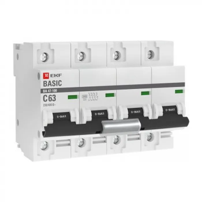 Автоматический выключатель EKF Basic 4P 63А (C) 10кА, mcb47100-4-63C-bas - это электрическое устройство, предназначенное для защиты электрических цепей от перегрузок и коротких замыканий.Данный автоматический выключатель имеет 4 полюса, что позволяет использовать его для подключения и защиты нескольких электрических цепей одновременно.