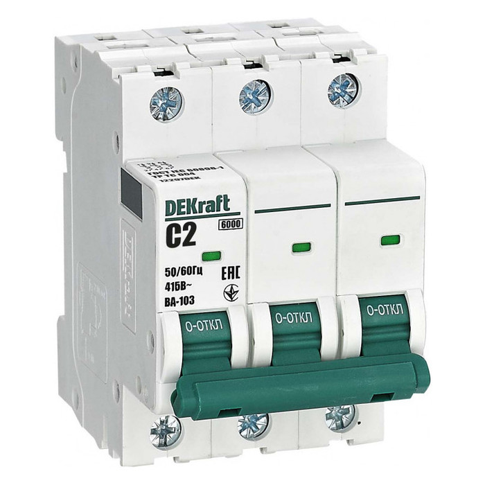 DEKraft ВА-103 3P 2А (C) 6кА, 12297DEK также обладает функцией дифференциальной защиты (C), что позволяет ему реагировать на небольшие токи утечки, что может быть полезно в защите от поражения электрическим током.