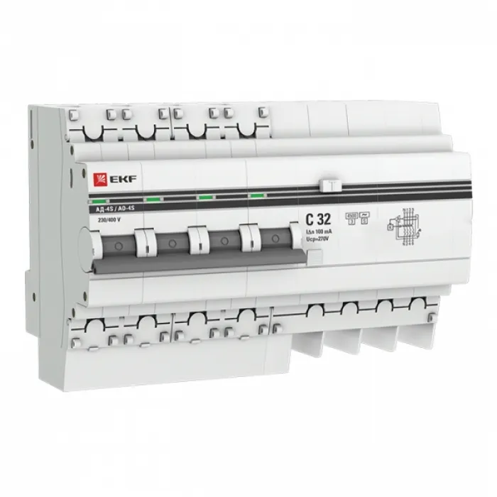 Дифавтомат EKF PROxima 3P+N 32А (C) 4.5 кА, 100 мА (AC), DA4-32-100S-pro - это автоматическое устройство, которое сочетает в себе функции дифференциального автомата и автоматического выключателя. Он предназначен для защиты электрических сетей от перегрузок и короткого замыкания.Дифавтомат имеет 3 полюса и нулевой полюс, что позволяет использовать его в трехфазных сетях. Максимальный ток нагрузки составляет 32А, что позволяет использовать устройство для различных электрических установок.