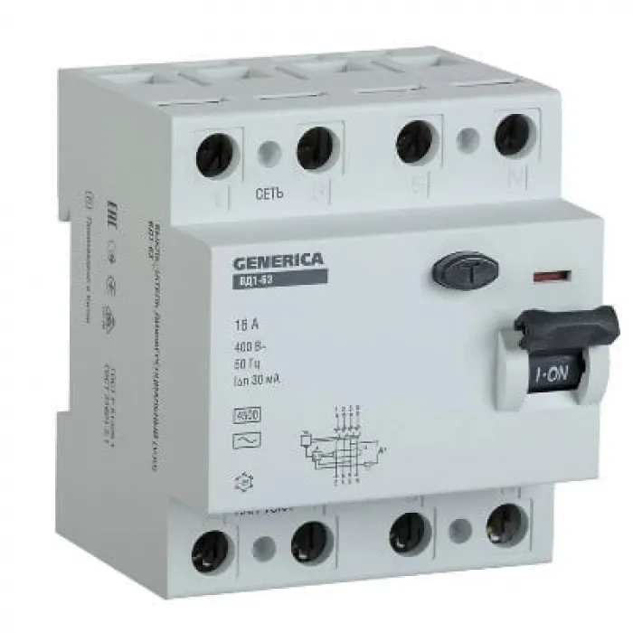 Быстродействующий защитный выключатель ВД1-63 (УЗО) GENERICA - устройство электронного типа, зависящее от напряжения и реагирующее на дифференциальный ток, без встроенной защиты от сверхтоков. Предназначен для защиты человека от поражения электрическим током.Кнопка "ТЕСТ" для проверки работоспособности устройства и правильности подключения.